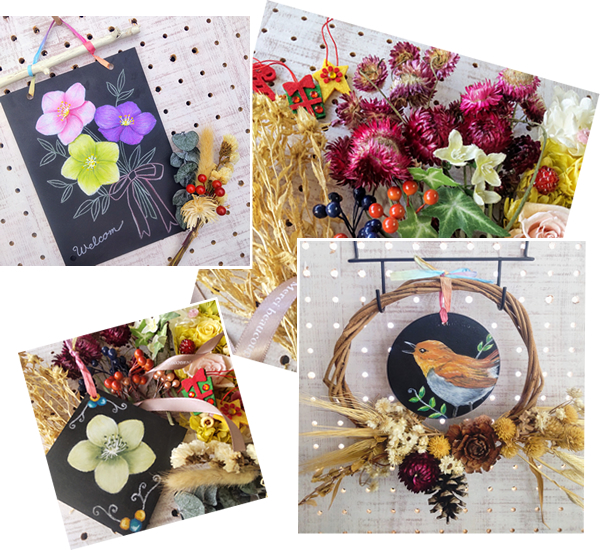 ドライフラワーや流木など自然の素材を使ってチョークアートと組み合せたオリジナルの作品を作ります。お部屋のインテリアや、プレゼントにも喜ばれます。こちらも初心者さん大歓迎!手ぶらでOK!見本作品の中からお好みの組み合せをチョイスして一緒に仕上がりを考えてから作りますのでご安心ください