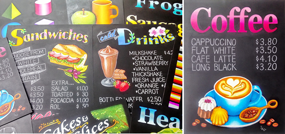 学校の黒板チョークとは違い、オイルパステルという画材を使います。ブラックボードに色を重ねて指で混ぜ合わせることによって濃淡をつけ、立体感や質感を描いていきます。触っても消えないように加工を施しますので野外でも使用でき、カラフルでポップなデザインは、カフェやレストランの看板やメニューボード、インテリアやウェルカムボードなど様々な用途があり、アートとしても人気があります。