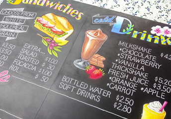 店頭に設置された黒板看板は、通りかかった人を店に呼び込む即効性があります。イラスト+レタリングでお客様に伝えたい内容を一目で分かりやすく伝える事ができるため、看板を見て入店されるお客様が増え、売上アップに繋がるお手伝いをさせてください。別途、店内のイメージアップのご提案、新メニューや既存メニューのご相談も承ります。