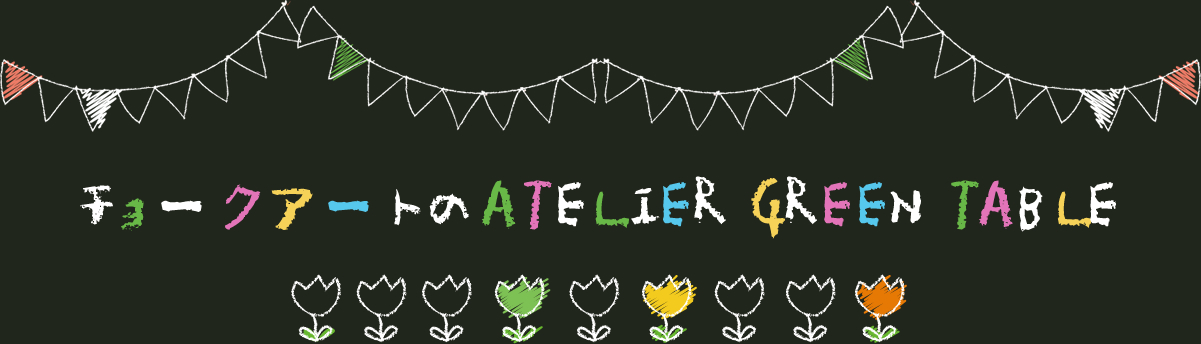 チョークアートのATELIER GREEN TABLE(アトリエ グリーンテーブル)では、鮮やかな色合いとポップなデザインで見ているだけで楽しい気分になれる、そんなチョークアートの魅力をお伝えしていきたいと思っております。初心者の方でも一から楽しく丁寧にレッスンしていきますので、お一人様からお子様連れまでお気軽にお問い合わせください。